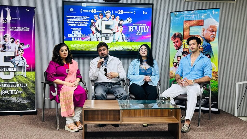 देहरादून। केएसएम फिल्म प्रोडक्शन्स ने देहरादून में आयोजित एक प्रेस कॉन्फ्रेंस के दौरान अपनी बहुप्रतीक्षित बॉलीवुड फिल्म 5 सितंबर की रिलीज की घोषणा करी। यह फिल्म 18 जुलाई को सिनेमाघरों में रिलीज होने जा रही है। इस फिल्म की शूटिंग लोकेशन, स्थानीय कलाकार, तकनीकी टीम, संगीत और कथा के गहरे स्थानीय जुड़ाव जैसी खासियतों की वजह से यह उत्तराखंड की सबसे बड़ी फिल्म मानी जा रही है। फिल्म में संजय मिश्रा, कुनाल शमशेर मल्ला, अतुल श्रीवास्तव, विक्टर बैनर्जी, कविन दवे, सारिका सिंह दवे, बृजेन्द्र काला, किरन दुबे, मलीहा मल्ला, ऋषभ खन्ना और उत्तराखंड के कई प्रतिभाशाली स्थानीय कलाकार नजर आएंगे।