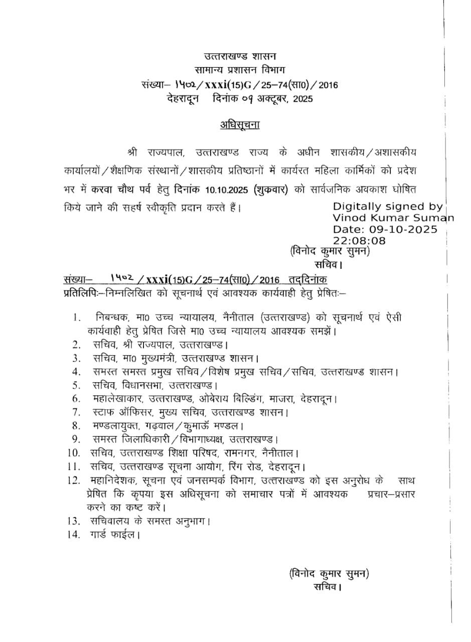 देहरादून। उत्तराखंड सरकार ने शुक्रवार को करवाचौथ के उपलक्ष्य में महिलाओं को सार्वजनिक अवकाश की सौगात दी है। सचिव विनोद कुमार सुमन की ओर से जारी आदेश के मुताबिक, शुक्रवार को करवाचौथ पर प्रदेश के सभी शासकीय, अशासकीय कार्यालयों, शिक्षण संस्थानों, शासकीय प्रतिष्ठानों में महिला कर्मियों के लिए सार्वजनिक अवकाश होगा।