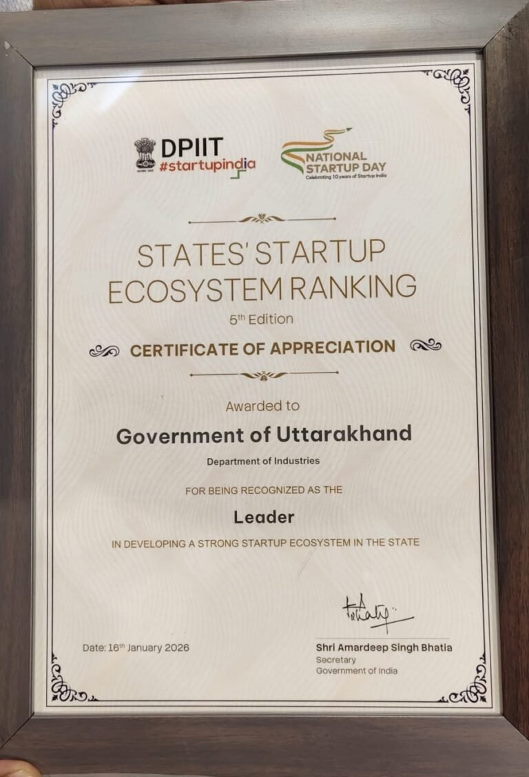 देहरादून। भारत सरकार के वाणिज्य एवं उद्योग मंत्रालय के अंतर्गत उद्योग संवर्धन एवं आंतरिक व्यापार विभाग (डीपीआईआईटी) के जारी स्टेट...